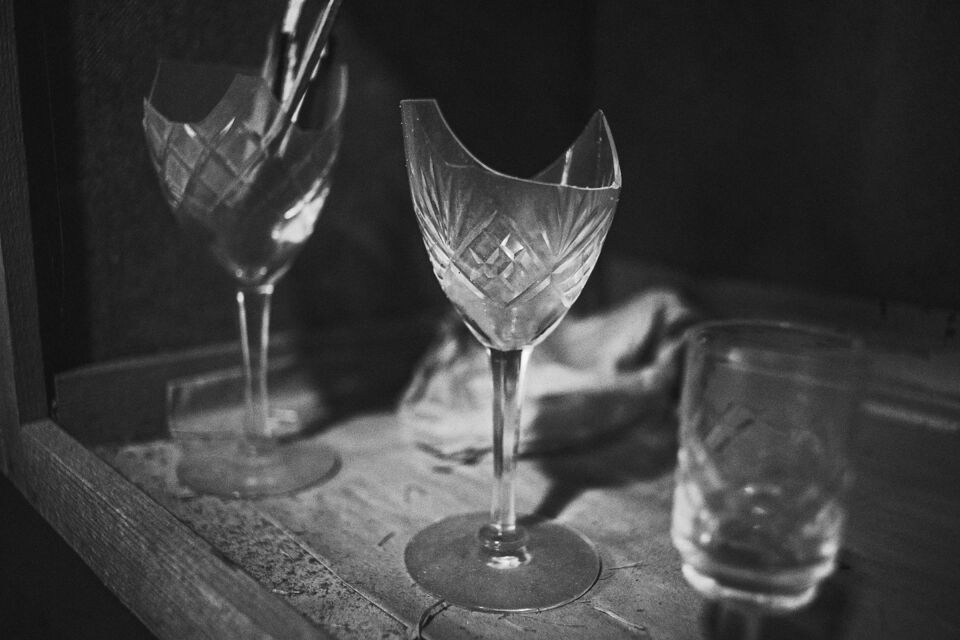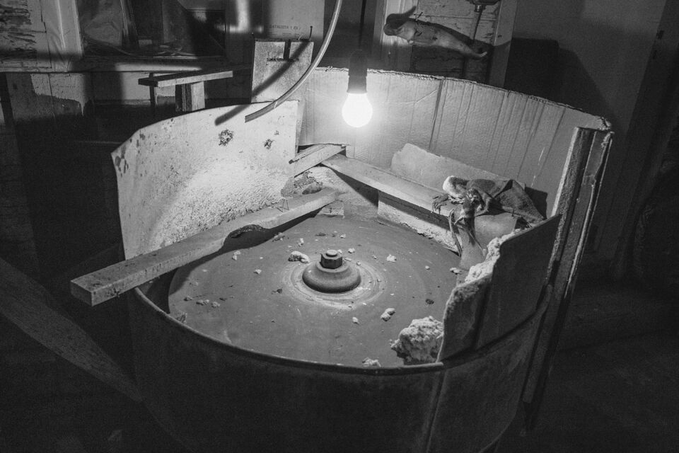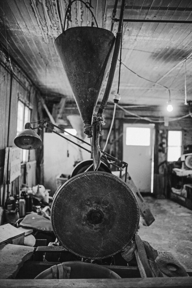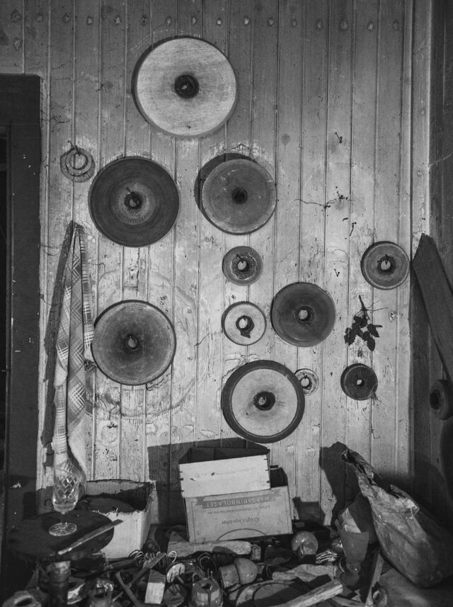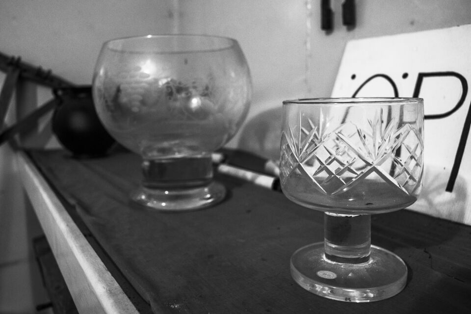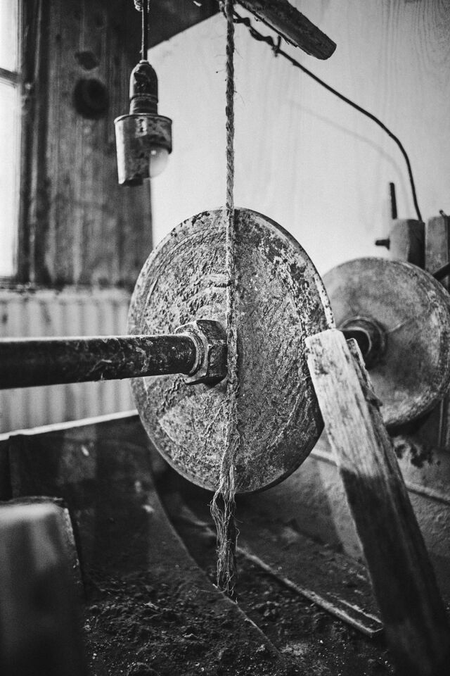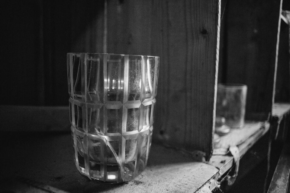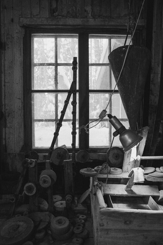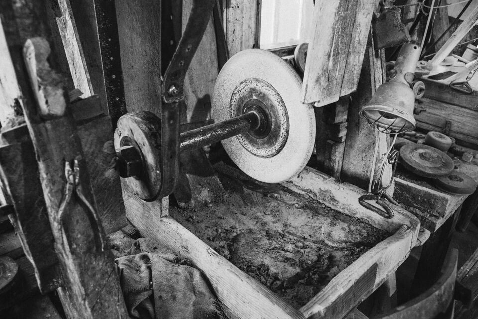 Det fristående sliperiet, Bröderna Greéns Glas och Kristallsliperi, startade 1927 och lades ner 1978. Men Göte, en av bröderna Greén, fortsatte med verksamhet ända till sin bortgång 1981. Efter det har sonen skött och sett till sliperiet vid sitt barndoms hem i Fagerhult mellan Lessebo och Kosta. Det har stått i samma skick som när det slutade slipas och dekoreras där för 45 år sedan. Idag lite dammigare och och inte lika "finputsat" som då givetvis. Men maskinerna ska i alla fall ha fungerat 2015 då en lokaltidning gjorde ett reportage. Sliperiet har dokumenterats tidigare av personer i en fotoklubb i samband med nedläggningen, men var dom bilderna finns idag har jag ingen susning om. Nu står fastigheten inför en försäljning och vad som händer med sliperiet efter det står skrivet i stjärnorna? Så jag åkte till visningen och passade på att ta några bilder med min digitala kamera. Det hade blivit knivigare med analogt här, dels pga ljusets kontraster men mest av tidsbrist och att stativ hade behövts i så fall, vilket inte hade funkat i den trånga lokalen när folk strömmade genom hela tiden under visningen. Jag gjorde dom till svartvitt samt lade även på lite korn. För att det skulle bli retrokänsla över det hela. Färg passade sämre som jag såg det. Jag tycker att det svartvita framhäver miljön i det naturliga ljuset (i några fall kompletterat med befintliga glödlampor) på ett sätt som färg inte kan. Bara en av de ca 100 bilderna jag tog hade tjänat lite på att visas i färg som jag upplever det. Så allt fick bli i svartvitt.
